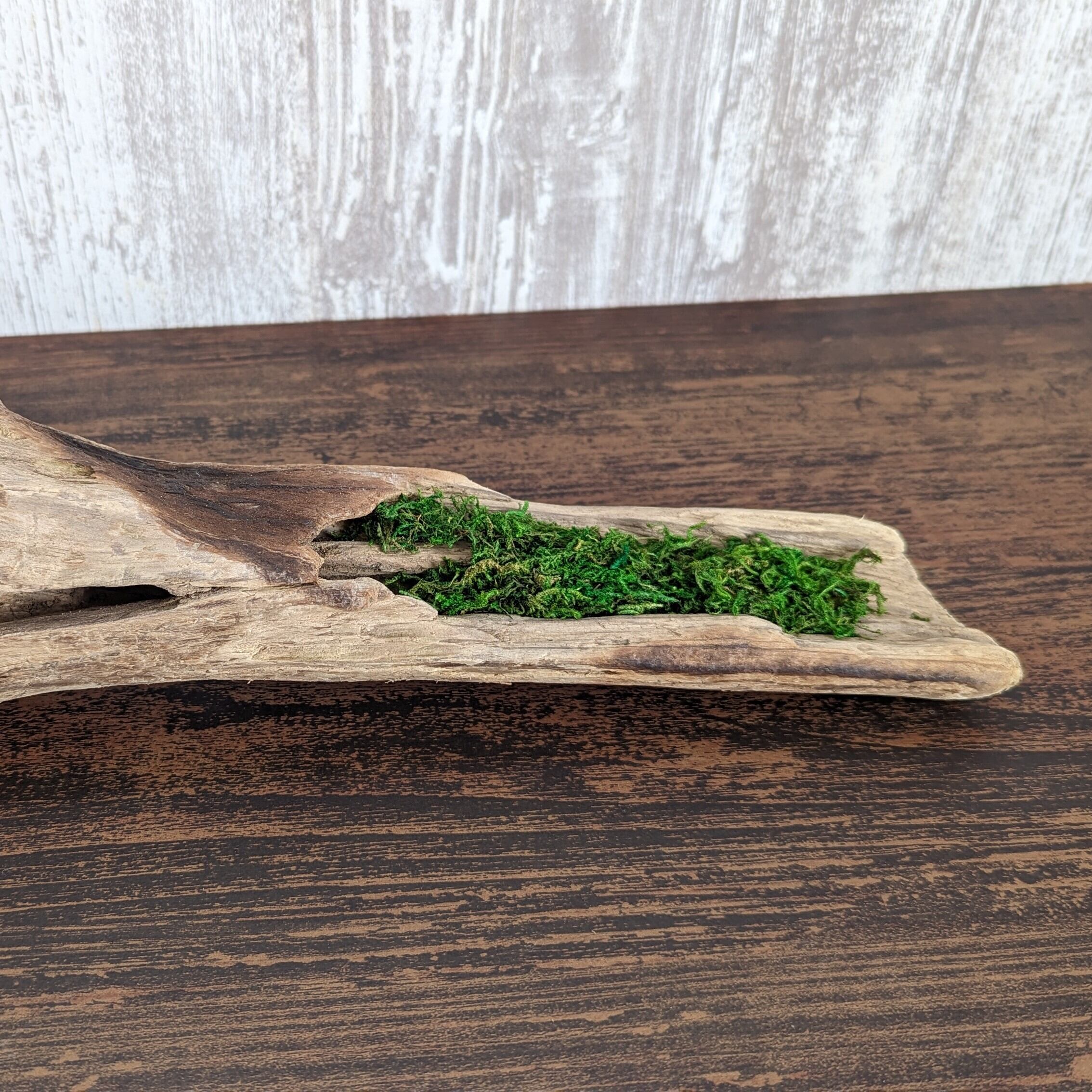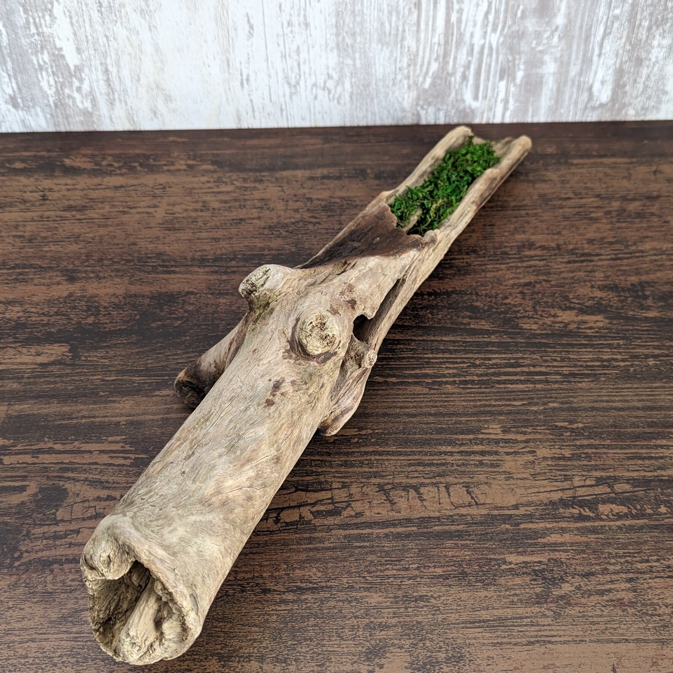 中ぶりの丸太に雰囲気のあるくぼみや空洞のできた、とてもおしゃれな流木です。そのまま置いていただくだけで、かなりの存在感。自然に出来たくぼみなどを生かしてお好きなエアプランツなどを合わせていただくと、家の中の小さな森をイメージさせてくれます。少し重量感のある、しっかりとした流木です。