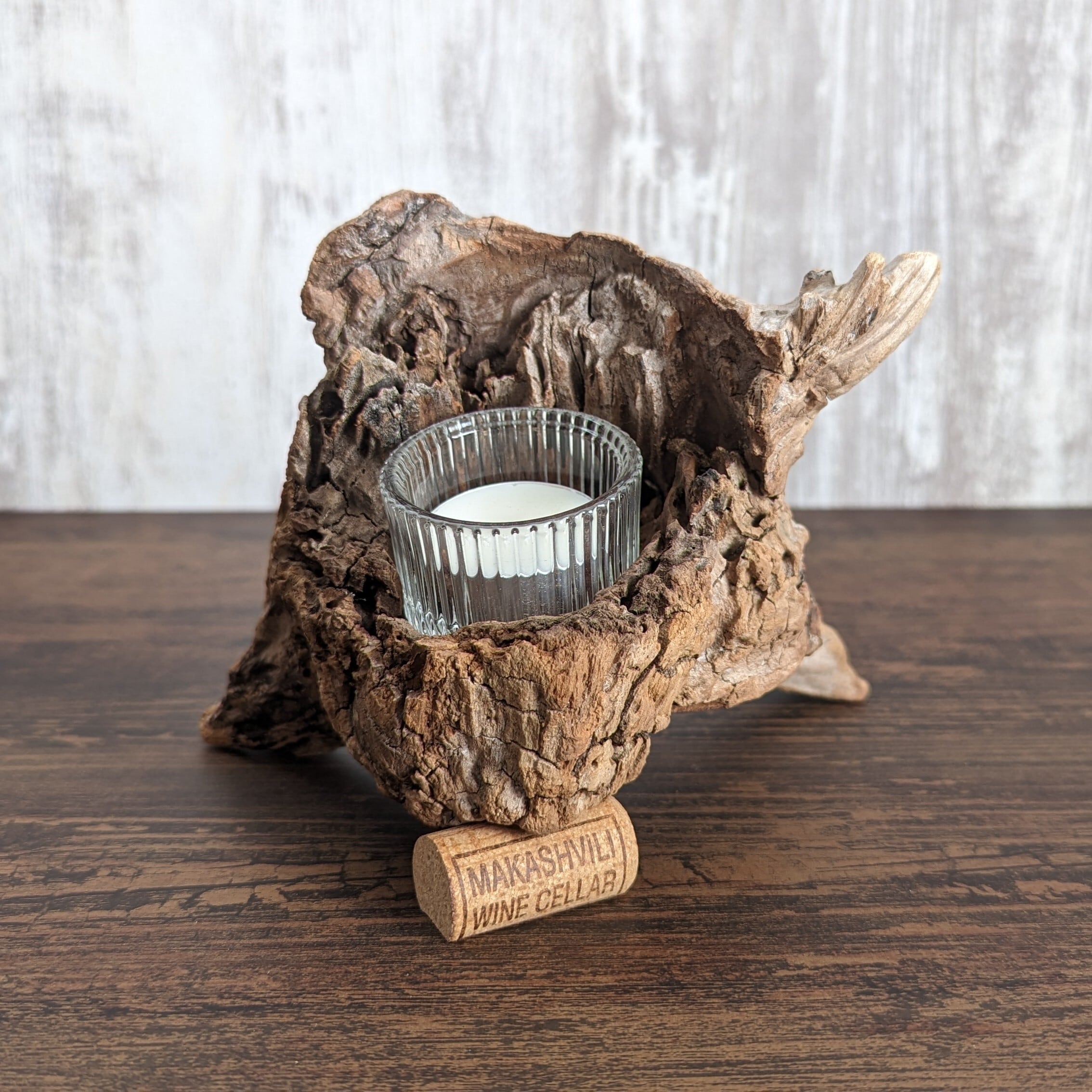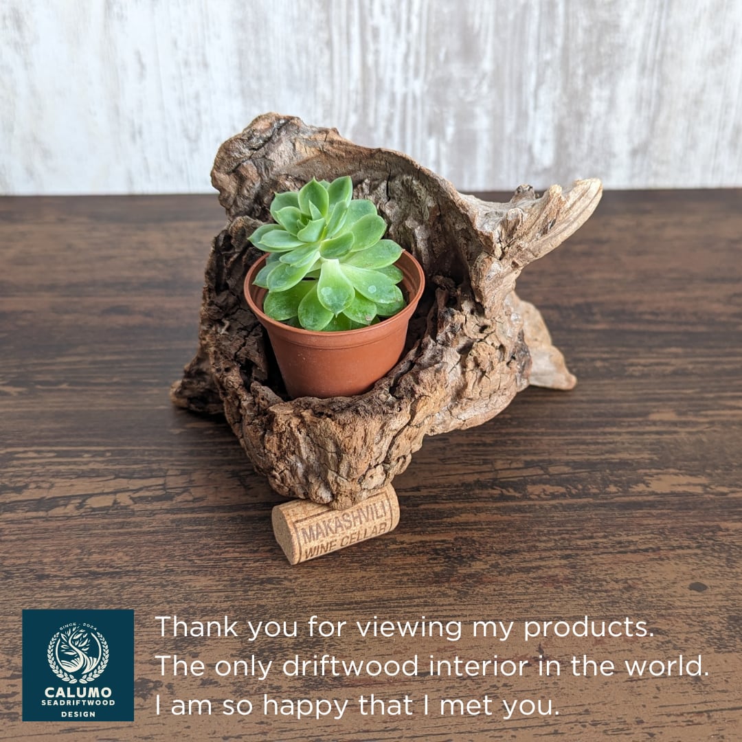 この流木は変わった流木で、赤松の流木になります。かたまりのような流木で樹皮がついたそのままの自然な風合いを残した商品になります。付属しておりますコルク栓で全面の高さを変えられます。真ん中のくぼみについては手を加えております。キャンドルまたは多肉植物やサボテンetc・・・ いろいろなものを入れてディスプレイしていただけるのではないかと思います。