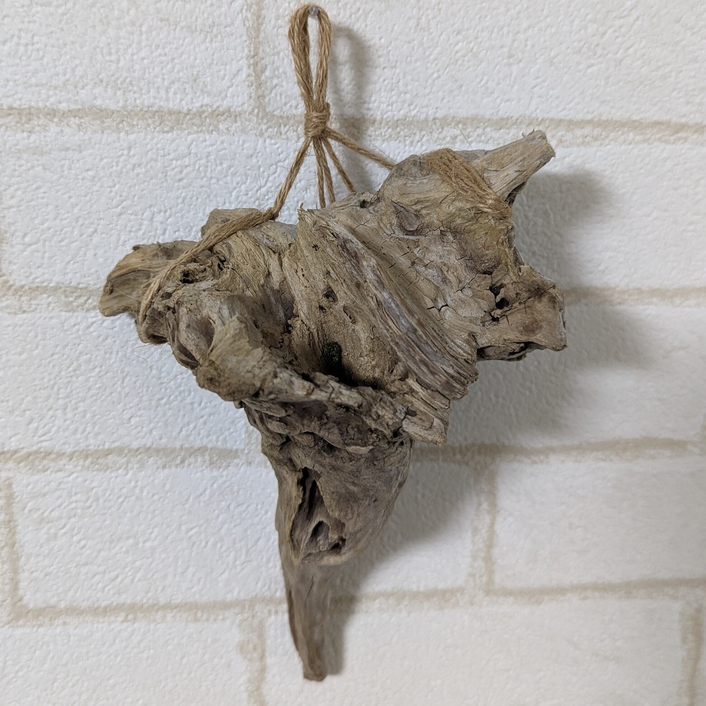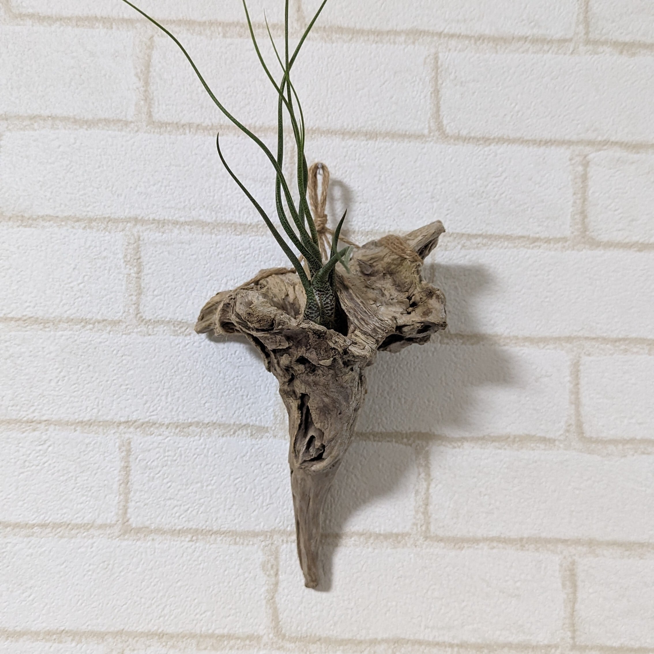 こちらの商品は、とても変わった個性ある流木となっております。壁掛け・置きがた、あなたのお好みでどちらでもお使いいただけます。自然なくぼみがあるため壁掛けの場合は、軸が細めのエアプランツが入るようになっております。置き型でお使いいただく場合は、麻紐の中に収まるようになっていますので、いろんな形のエアプランツと合わせていただけます☆ みなさまのセンスとお好みでオシャレな空間へ。