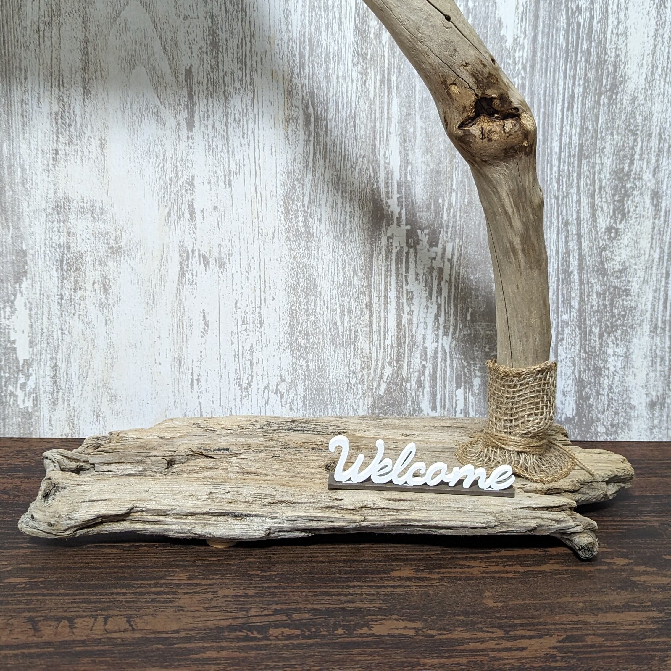 こちらの商品は、存在感ばっちりの流木となっております。台座についているWelcomeの文字プレートは付属されてます。ご自分でお好みのフレーズのプレートや、店舗にてOPENプレートなどを吊り下げて使っていただいても良いのではないかと思います。吊り下げタイプのアルミプレートは写真撮影のため、付属されておりませんのでご了承ください。